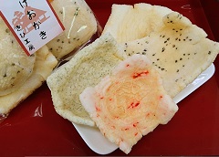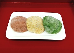 |  |  |  | |  | 餅三彩 3個入 450円 1個(150円)からでも販売しております。 | 三色だんご 3本入 300円 1本(100円)からでも販売しております。 | おはぎ 2個入 300円 |  | |  | 揚げおかき 1袋 300円 | きび羽二重 1カップ 200円 | 切り餅 1袋 550円 | | |  きびもちソフトクリーム 300円 バニラベースに地元産のものを加工して作られた きび粉やもち粉を混ぜ合わせてできた ソフトクリームです。 ふんわり香ばしいような独特の風味が 人気を呼んでいます! (※冬期販売中止) |  | | | | | |